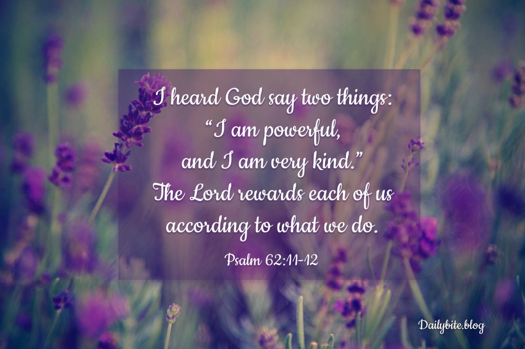 “I heard God say two things: I am powerful and I am very kind.” The Lord rewards each of us according to what we do. Psalm 62:11-12