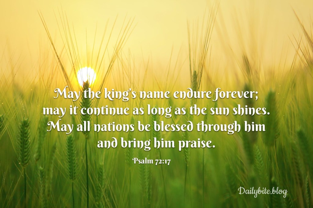 May the king’s name endure forever; may it continue as long as the sun shines. May all nations be blessed through him and bring him praise. Psalm 72:17