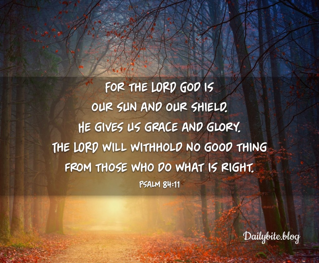 For the LORD God is our sun and our shield. He gives us grace and glory. The LORD will withhold no good thing from those who do what is right. Psalm 84:11