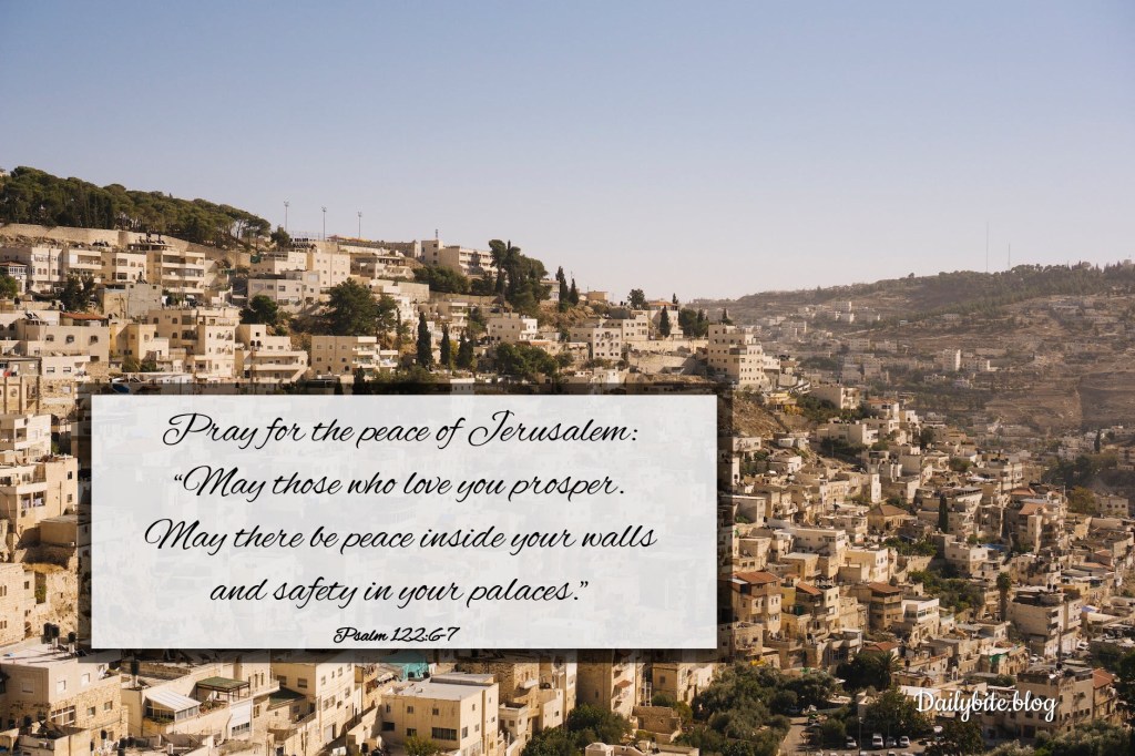 Pray for the peace of Jerusalem: “May those who love you prosper. May there be peace inside your walls and safety in your palaces.” Psalm 122:6-7